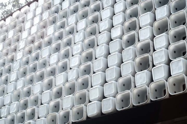 Endonezya’nın Batı Java bölge başkenti Bandung kentinde inşa edilen kütüphanenin plastik dondurma kapları çelik bir strüktüre sabitlenmiş. Şiddetli tropikal fırtınalar sırasında binanın içinin zarar görmemesi amacıyla kapalı bir mekân yaratmak için cephenin arkasına yarı saydam sürgülü kapılar da monte edilmiş.