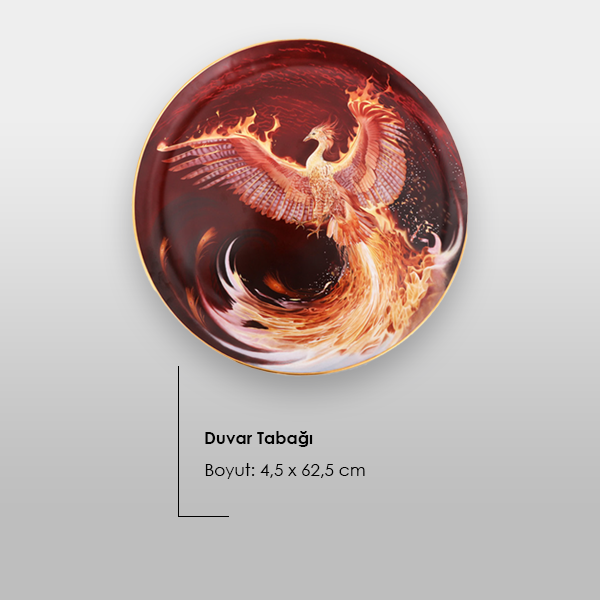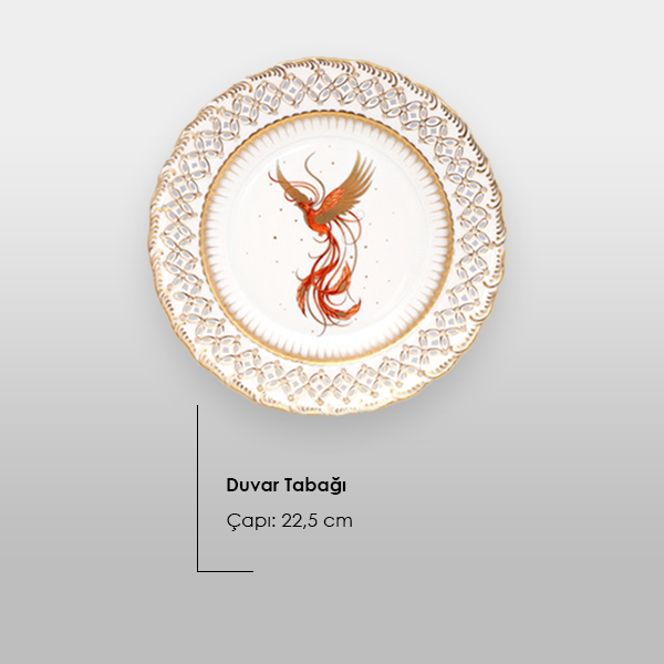 Heren Porselen’in bu harika duvar tabağında Anka Kuşu muhteşem alevlerin içinden mükemmel renkleriyle yeniden doğuyor. Bu sanat eseri tabağın çapı 22,5 cm’dir.