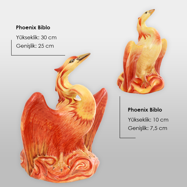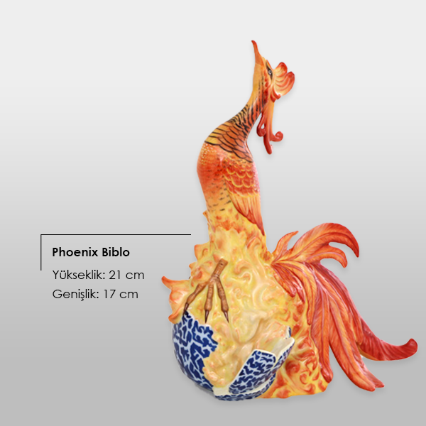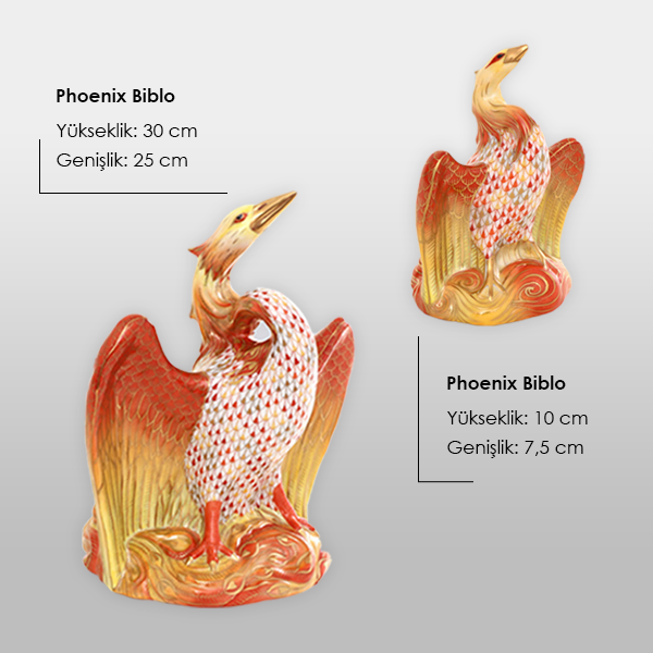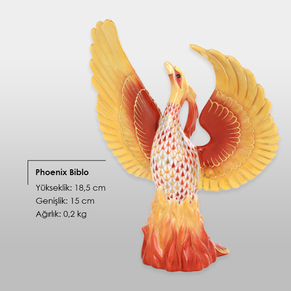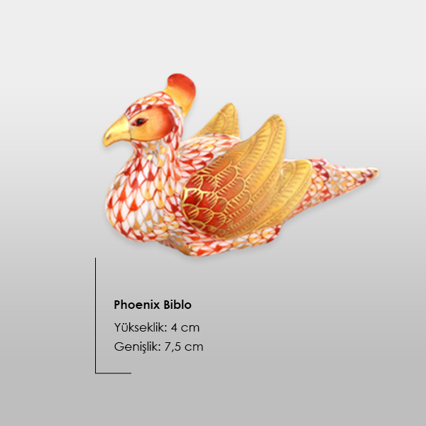 Birden çok sarı ve kırmızı tonu kullanılarak oluşturulan Herend Anka Kuşu Biblosu, yaydığı alev enerjisiyle içinizi ısıtacak. Gövdesinde klasik balık pulu deseni, kanatları ve gagasında ise 24 ayar altın işlemeler kullanıldı. Herend’in Anka Kuşu - Phoenix Koleksiyonu’nun en göz kamaştıran parçası olan bu biblonun boyutları 18,x 15 x 8,5 cm, ağırlığı ise 0,2 kg’dır.