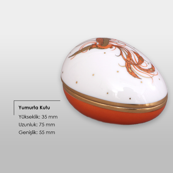 Herend’in yumurta şeklindeki kutu setine muhteşem Anka Kuşu - Phoenix tasarımı da dahil oldu. Yükseklik 35 mm, uzunluğu 75 mm, genişliği 55 mm olan bu nadide el yapımı kutu, Herend sanatçılarının imzasını taşımaktadır.