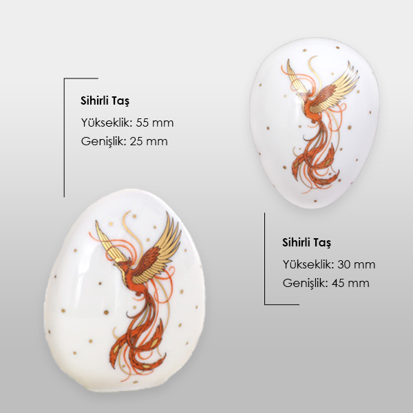 Koleksiyonun bir diğer değerli parçası ise sihirli Anka Kuşu taşıdır. Bu sihirli taş ile siz de evinizin dekorasyonuna büyü katabilirsiniz. Sihirli taş, Herend Porselen Phoenix Koleksiyonu’na iki farklı boyutuyla katılıyor: 30x45 ve 55x25 mm