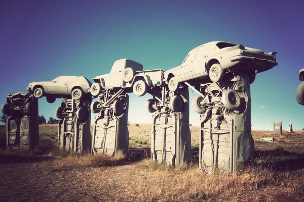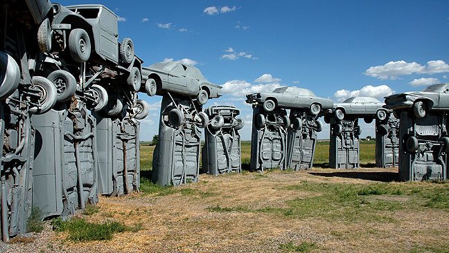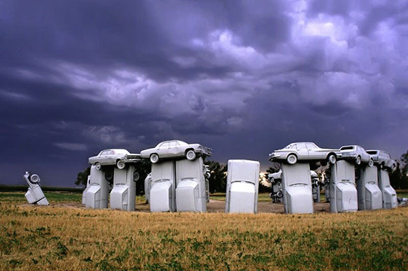 Alliance’da bir çiftlik alanına kurulu olan Carhenge tamamı orjinal ve vintage amerikan arabalarından oluşturulan bir çılgınlık. Arabalar, yakın civardaki çiftliklerden ve araba çöplüğünden alındılar. Sprey boyayla çok profesyonelce griye boyanan arabalar, bakıldığında taş görüntüsü vererek, Stonehenge’e atıfta bulunuyorlar. Sergi alanı, 39 otomobilden oluşuyor. Temel taş görevindeki araba, 1962 model bir Cadillac. Alanda 3 yabancı araba da gömülü ve mezar taşlarında; ‘ Burada 3 yabancı arabanın kemikleri bulunmakta. Detroit uyuduğunda, işlerini gördüler. Şimdi Detroit ayakta ve Amerika şaha kalkmış durumda’ yazmakta.