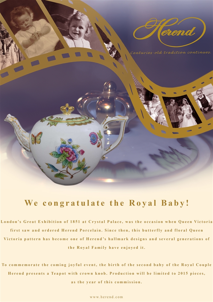 Kraliyet çiftinin yakında gerçekleşecek ikinci bebeklerinin dünyaya gelmesinin sevindirici anısına,Herend bu başlıklı çay demliğini sunmaktadır.