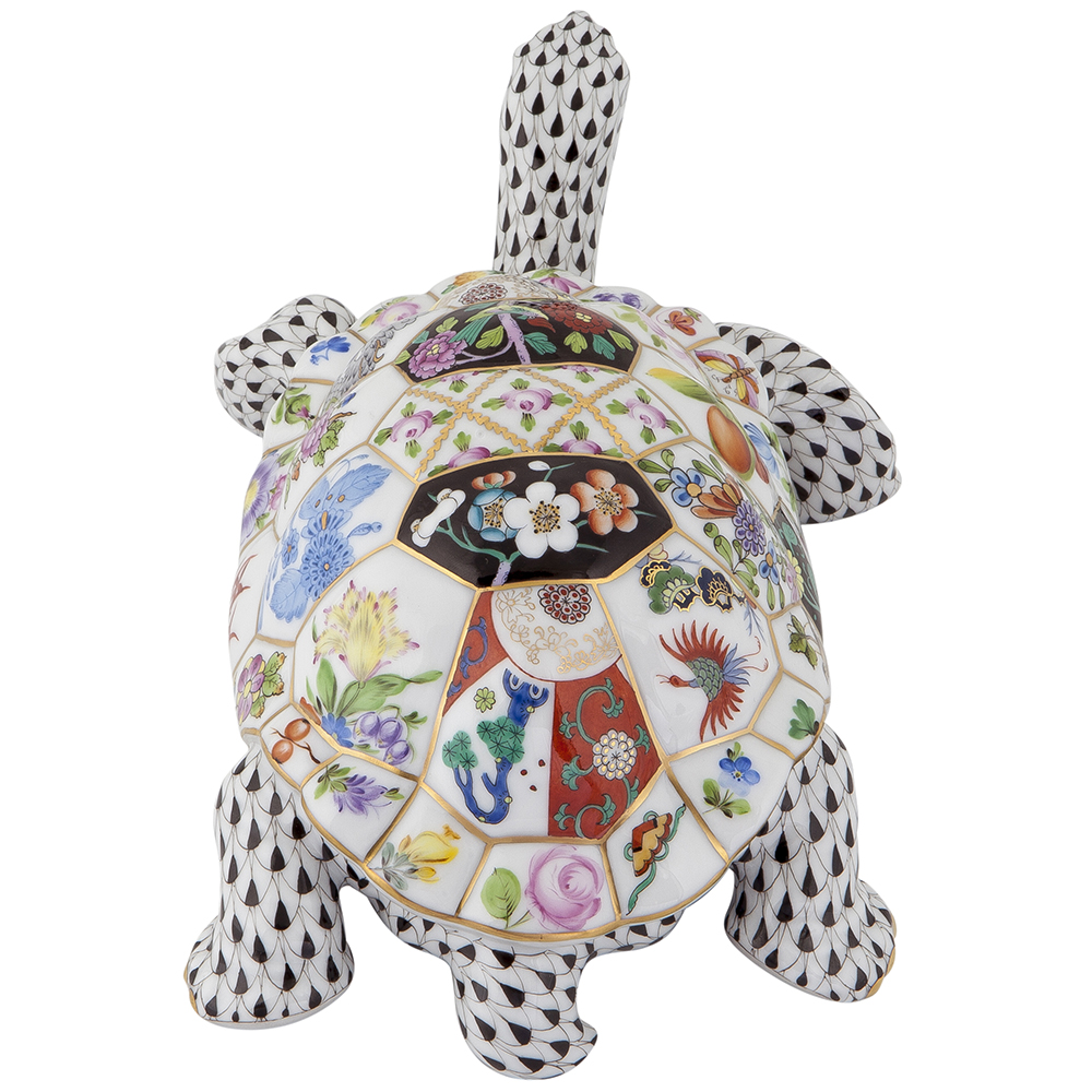 Kaplumbağanın kabuğunun her bir dilimine Herend Porselen’in eşsiz desenlerinden biri işlenmiştir.