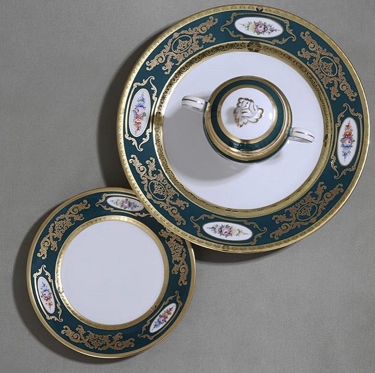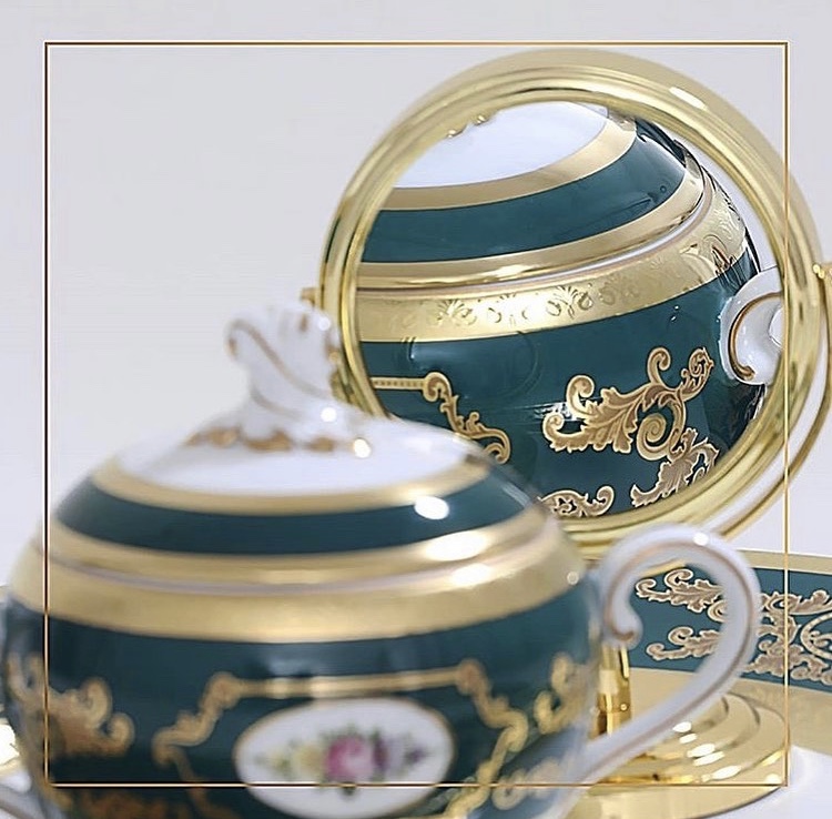 Bu özel Herend porselen seti, zengin yaldız ve ince fırça darbeleriyle boyanmıştır. Altının ihtişamı, koyu yeşil fon ile keskin ve mükemmel bir şekilde tezat oluşturmaktadır.