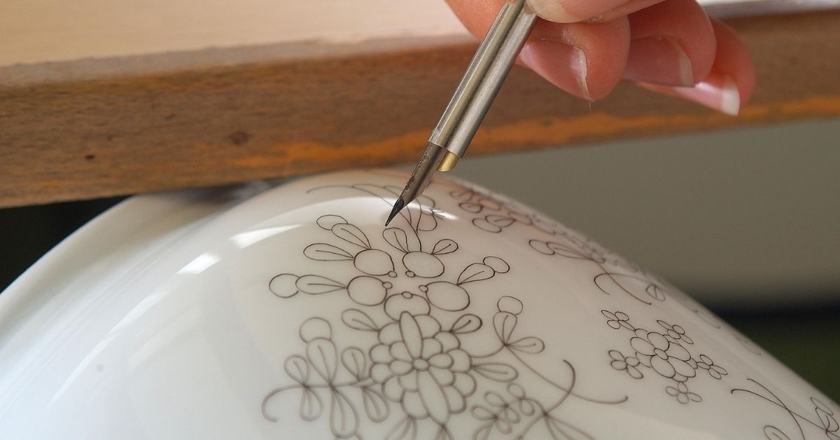 Renklendirmeye geçmeden önce bazı desenler porselenin üzerine bir kalemle çizilir.