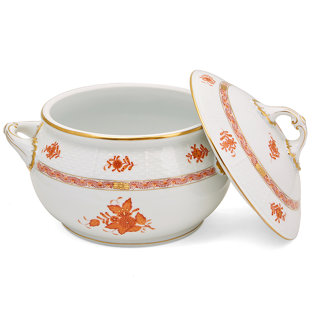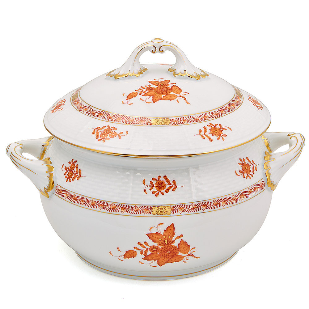 Çorba servisi, APPONYI desen, birbirinden özel dekor ve desenlere sahip el boyaması Herend Porselen koleksiyonu ile sofralarınızı zenginleştirin. Servis parça ve tabaklarını değişik boylarda yemek tabakları ile tamamlayabilirsiniz. Herend porselen yemek takımınızı oluştururken, takım parçalarınızı tekli olarak seçebilir arzunuza göre set oluşturabilirsiniz. Ayrıca birbirinden farklı desen ve dekorları da karıştırabilirsiniz. Bu servis parçasının yemek takımı, büyük, küçük, renkli, çeşitli servis tabakları, çorbalık, meze tabakları, oval ve yuvarlak servisleri, kare servisleri, salata servisleri, pilav servisi, sebze servisi, kaseler ve kapaklı servis parçaları mevcuttur.