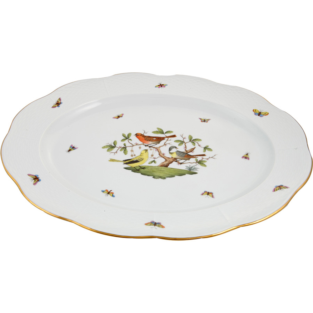 Oval servis, ROTHSCHILD desen, birbirinden özel dekor ve desenlere sahip el boyaması Herend Porselen koleksiyonu ile sofralarınızı zenginleştirin.Servis parça ve tabaklarını değişik boylarda yemek tabakları ile tamamlayabilirsiniz. Herend porselen yemek takımınızı oluştururken, takım parçalarınızı tekli olarak seçebilir arzunuza göre set oluşturabilirsiniz. Ayrıca birbirinden farklı desen ve dekorları da karıştırabilirsiniz. Bu oval servis tabağının yemek takımı, büyük, küçük, renkli, çeşitli servis tabakları, kulplu servis tabakları, çorbalık, meze tabakları, yuvarlak servisleri, kare servisleri, salata servisleri, pilav servisi, sebze servisi, büyük küçük kaseleri ve kapaklı servis parçaları mevcuttur.