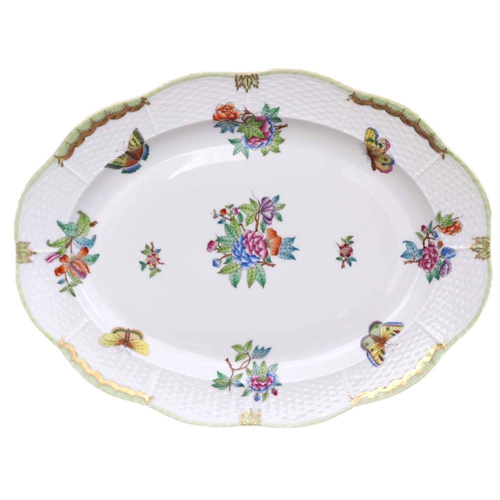 Oval servis, VICTORIA desen, birbirinden özel dekor ve desenlere sahip el boyaması Herend Porselen koleksiyonu ile sofralarınızı zenginleştirin. Servis parça ve tabaklarını değişik boylarda yemek tabakları ile tamamlayabilirsiniz. Herend porselen yemek takımınızı oluştururken, takım parçalarınızı tekli olarak seçebilir arzunuza göre set oluşturabilirsiniz. Ayrıca birbirinden farklı desen ve dekorları da karıştırabilirsiniz. Bu oval servis tabağının yemek takımı, büyük, küçük, renkli , çeşitli servis tabakları, kulplu servis tabakları, çorbalık, meze tabakları, yuvarlak servisleri, kare servisleri, salata servisleri, pilav servisi, sebze servisi, büyük küçük kaseleri ve kapaklı servis parçaları mevcuttur.