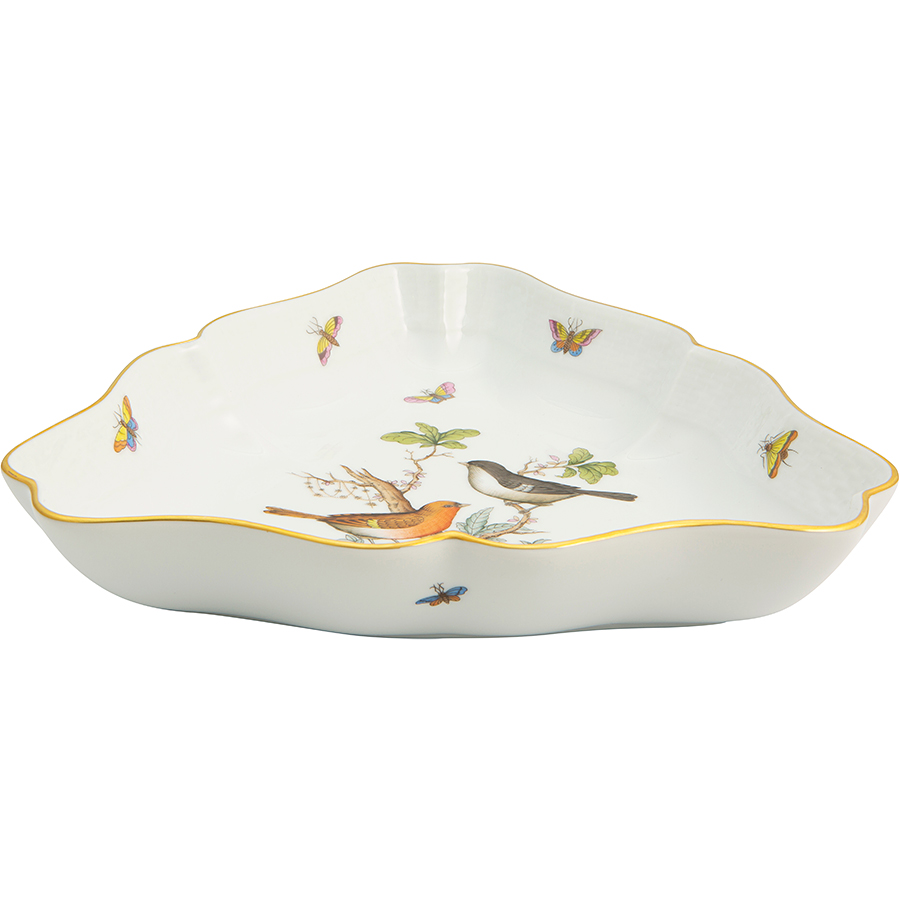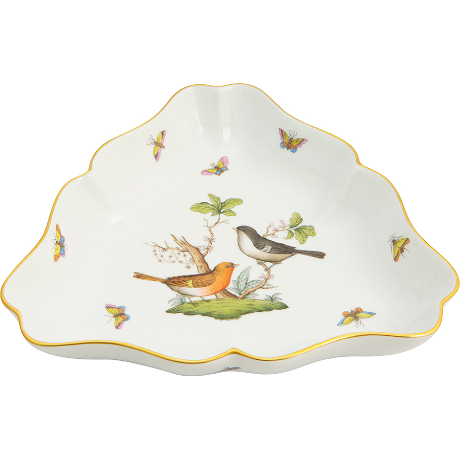 Üçgen servis, ROTHSCHILD desen, birbirinden özel dekor ve desenlere sahip el boyaması Herend Porselen koleksiyonu ile sofralarınızı ve evinizi zenginleştirin. Bu küçük üçgen tabak hem çerezlik, reçellik, zeytinlik, olarak hem de evinizde dekoratif amaçla kullanıma uygundur. Ürünü diğer Herend aksesuarlarla tamamlayabilir, kahvaltı sofraları ve takımı oluşturabilirsiniz. Bu parça ile takımlayabileceğiniz bölmeli servisler, bardak altlıkları, çukur servisler, servis tepsileri, çay ve kahve fincanları ve Herend desenli peçeteler sunumlarınıza zenginlik katacaktır.